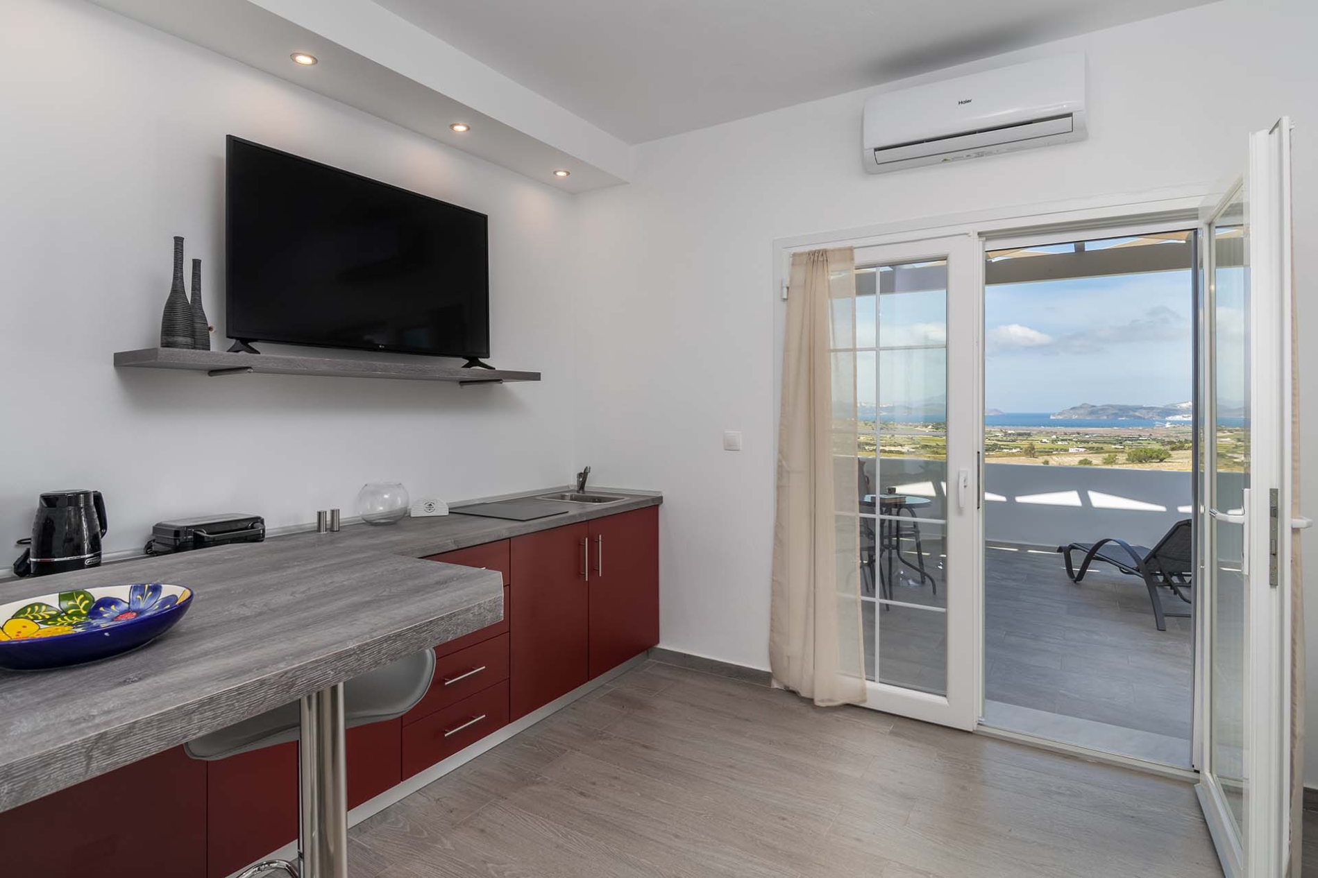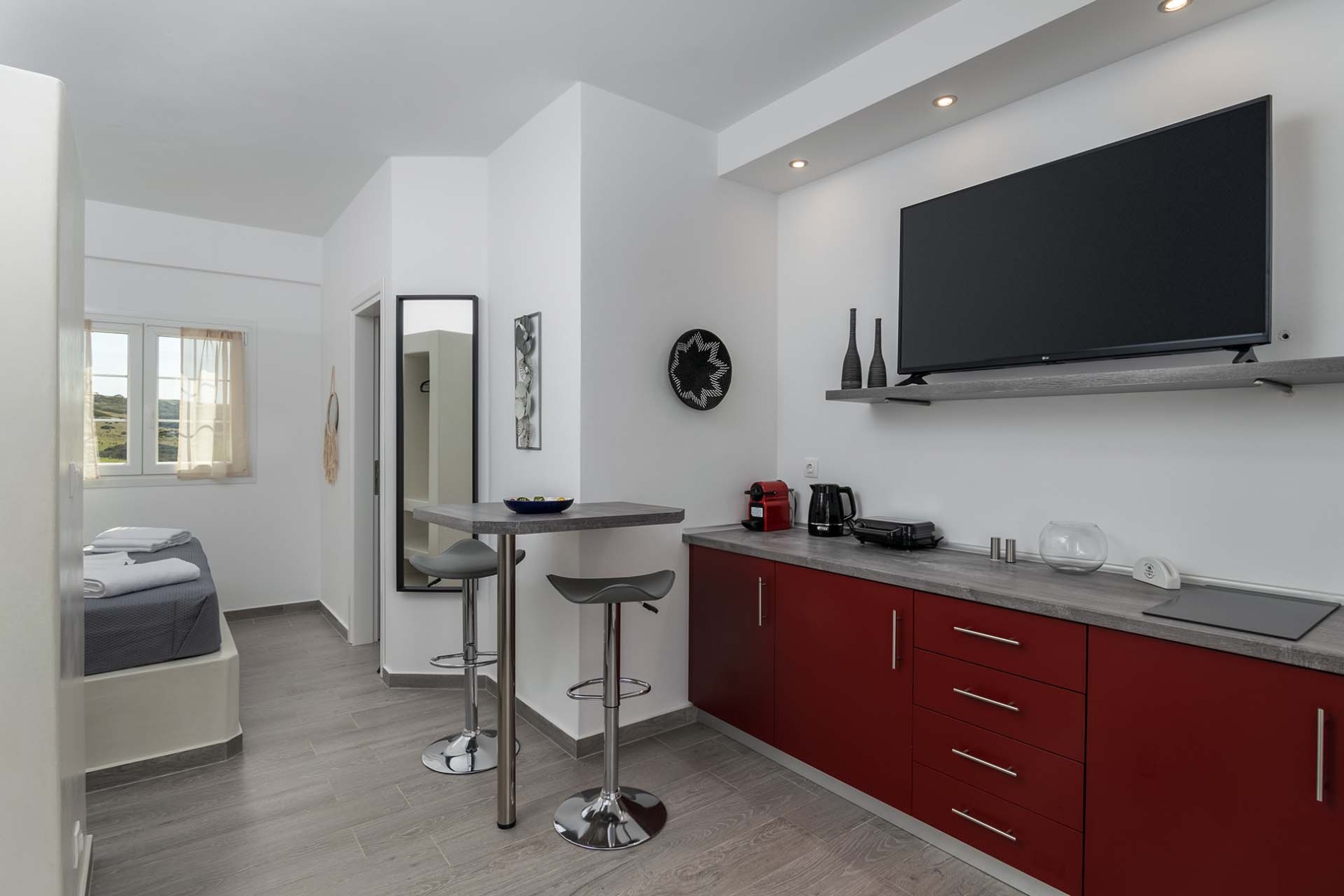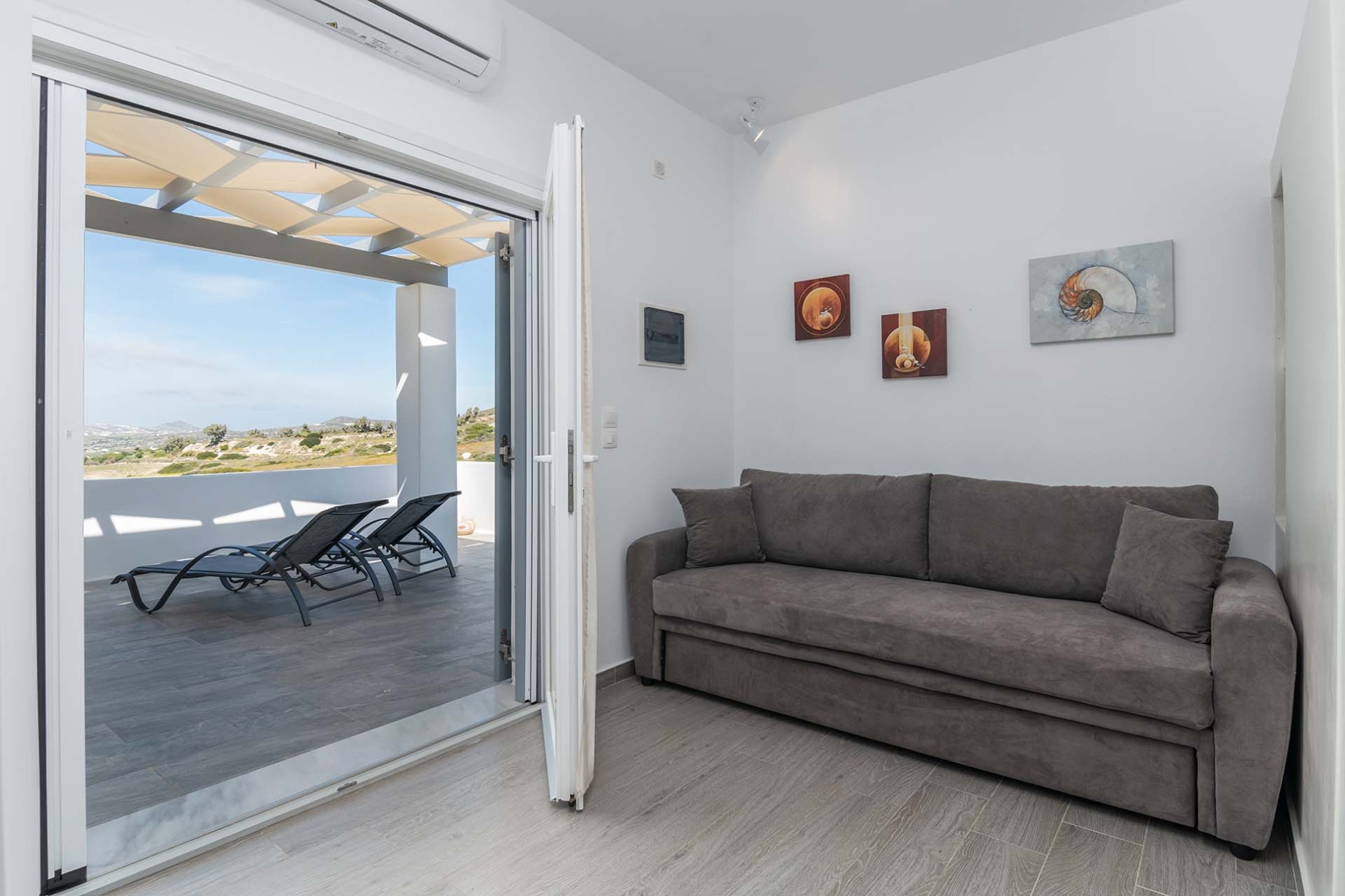 Das Apartment im Kykladenstil bietet eine gelungene Mischung aus modernem Komfort und traditionellem Charme. Ein gemütliches Sofa und ein großer Fernseher laden zum Entspannen ein, und das geräumige Badezimmer bietet viel Platz. Auf der weitläufigen Panoramaterrasse erwarten Sie Sonnenliegen und ein Esstisch - ideal zum Essen oder Entspannen im Freien.