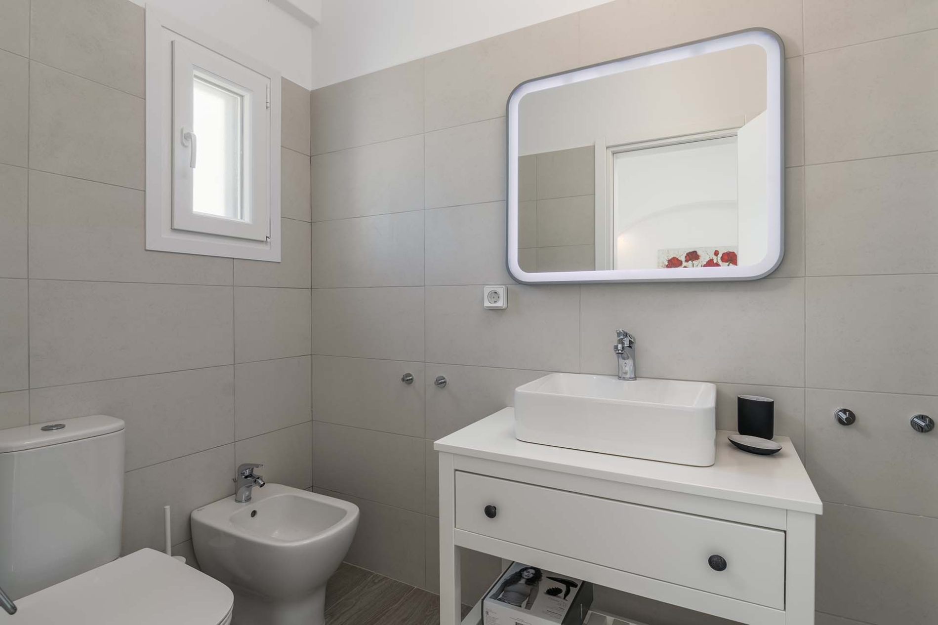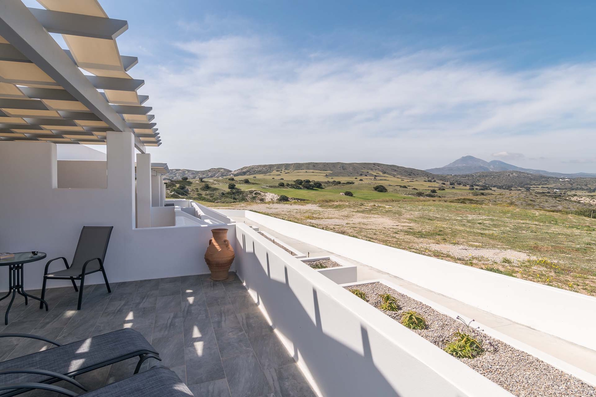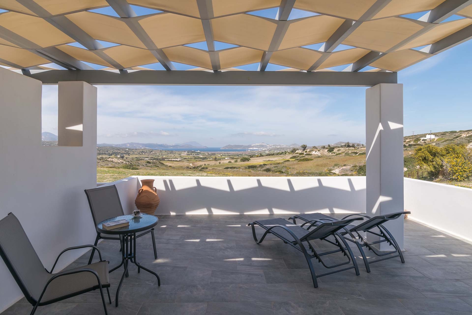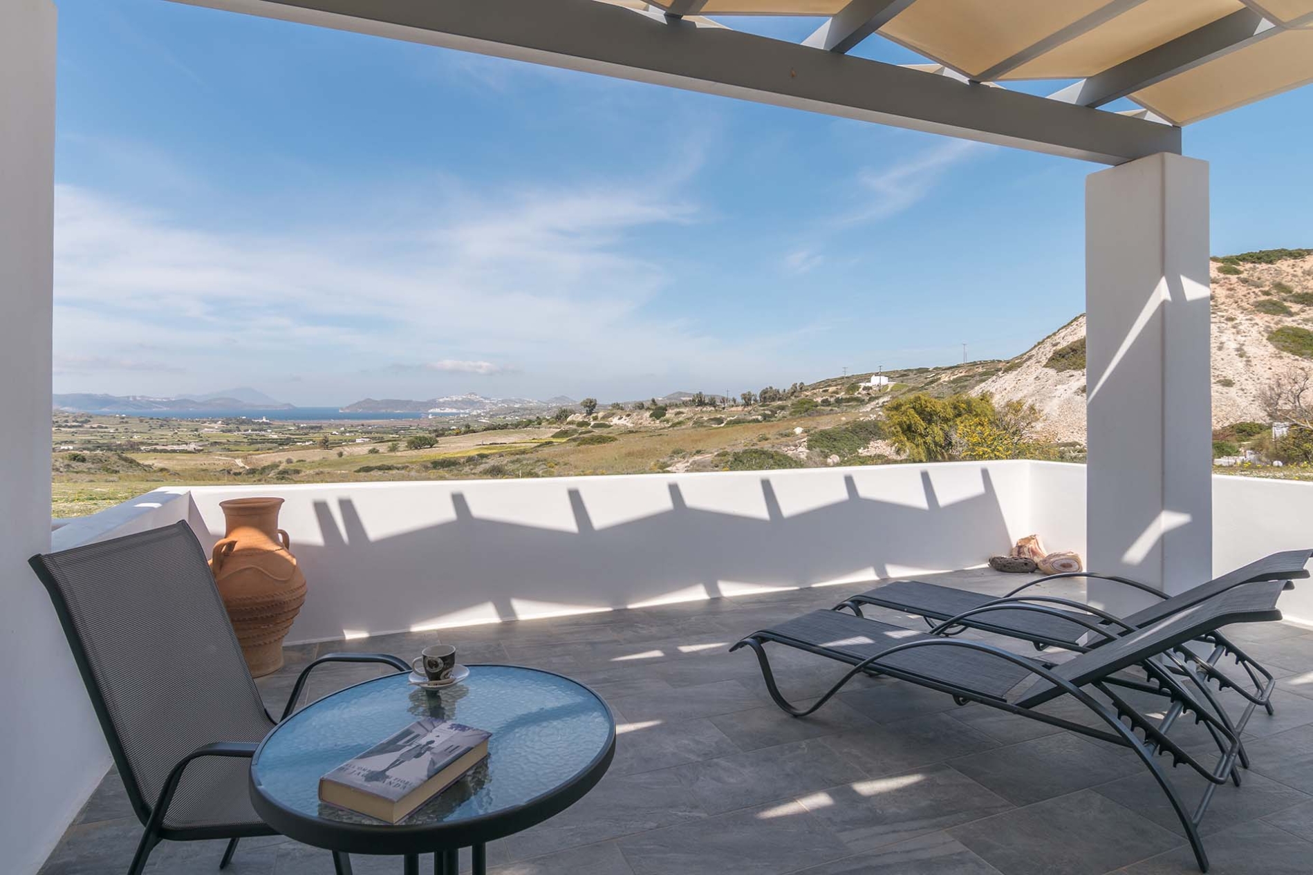 Das Apartment im Kykladenstil bietet eine gelungene Mischung aus modernem Komfort und traditionellem Charme. Ein gemütliches Sofa und ein großer Fernseher laden zum Entspannen ein, und das geräumige Badezimmer bietet viel Platz. Auf der weitläufigen Panoramaterrasse erwarten Sie Sonnenliegen und ein Esstisch - ideal zum Essen oder Entspannen im Freien.