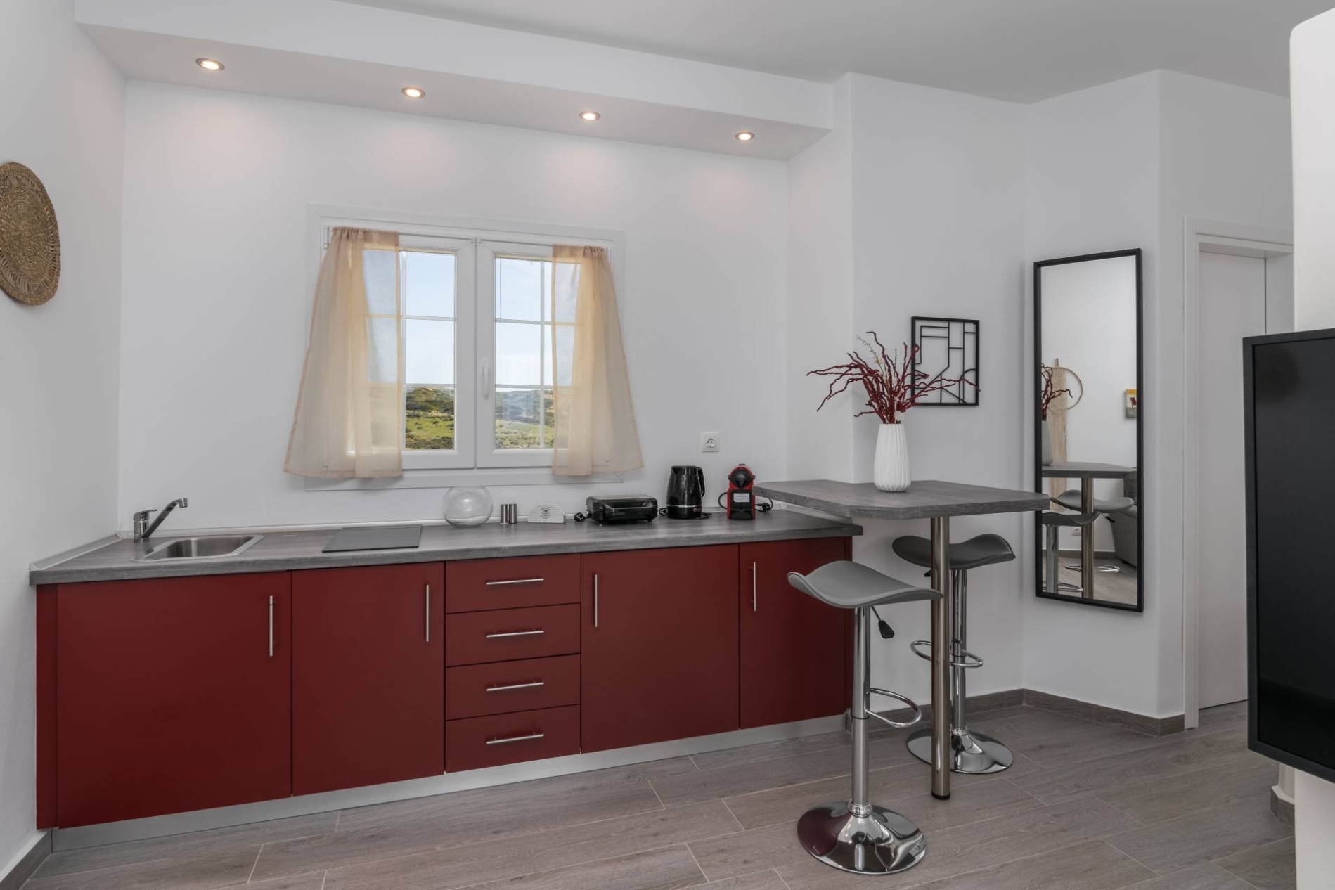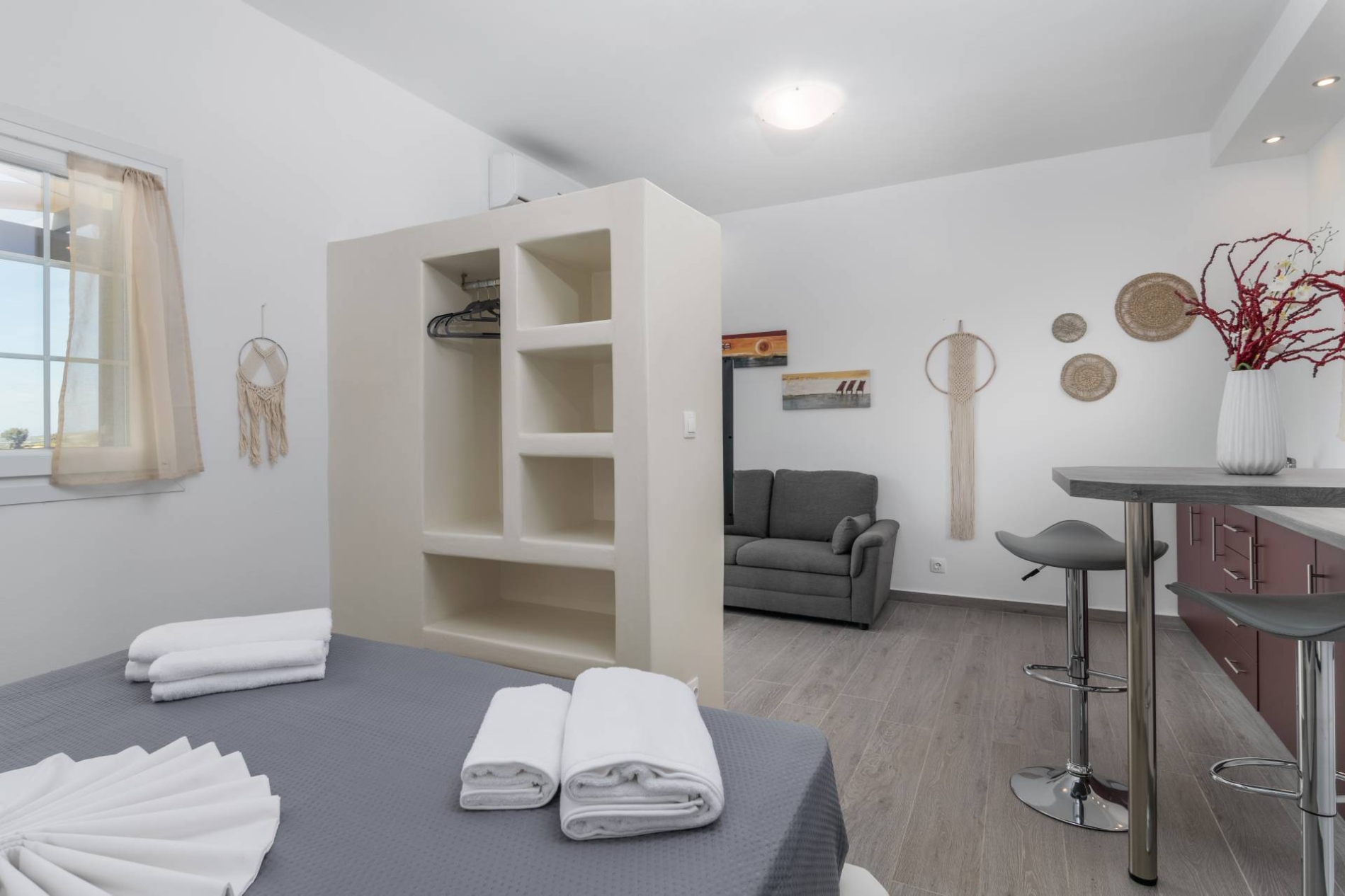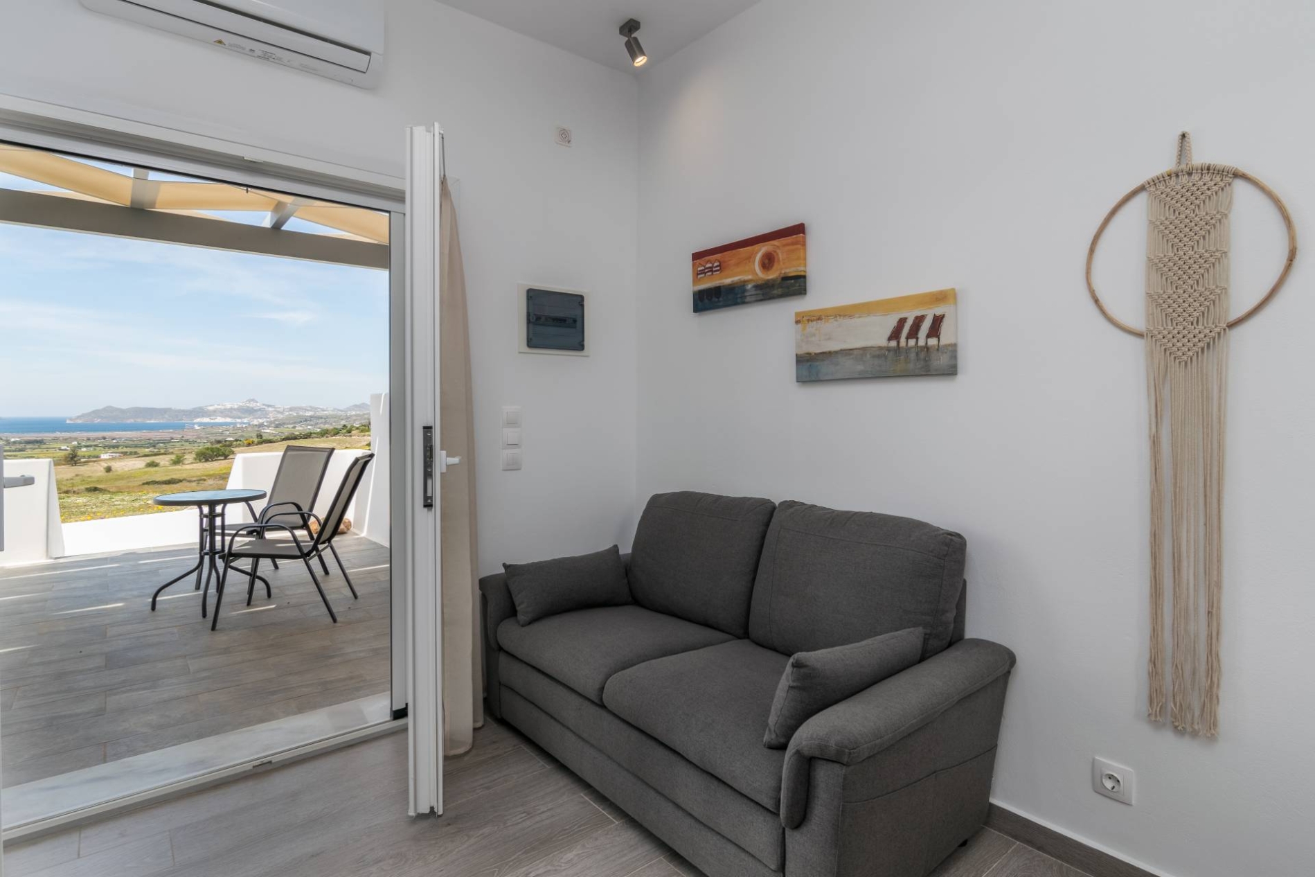 El apartamento de estilo cicládico combina comodidad moderna con encanto tradicional, con un cómodo sofá y un televisor de pantalla grande para entretenerse, y un espacioso baño. Salga a la amplia terraza panorámica, donde encontrará tumbonas y una mesa de comedor, ideales para disfrutar de comidas o relajarse al aire libre.