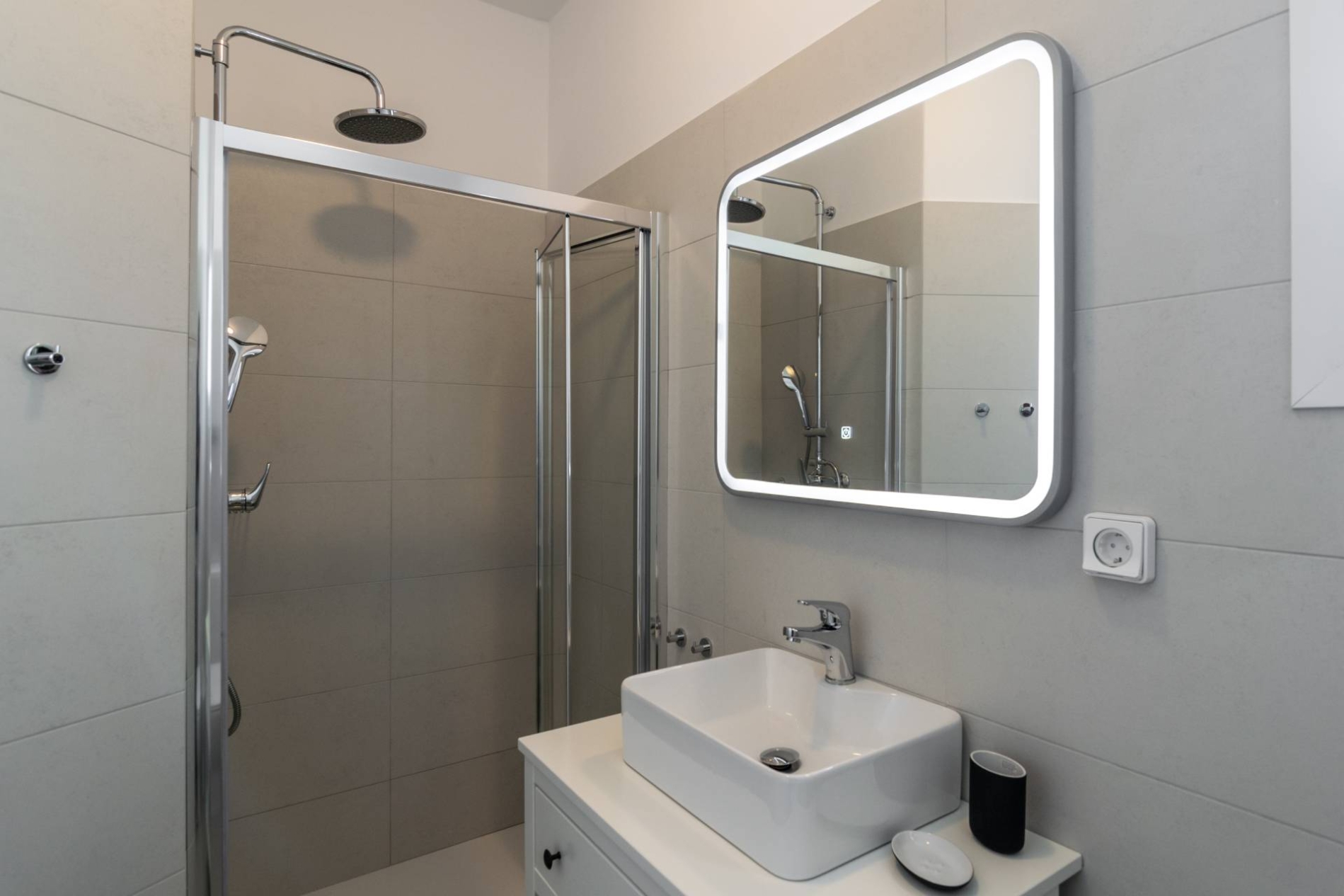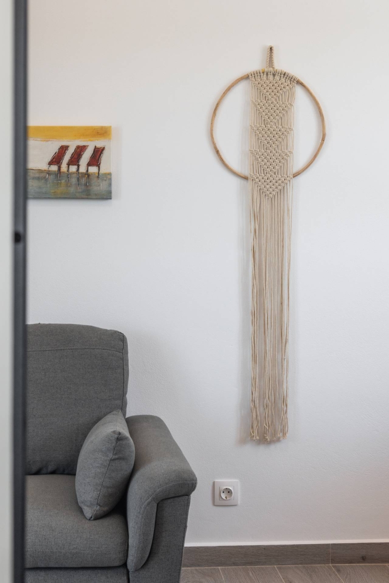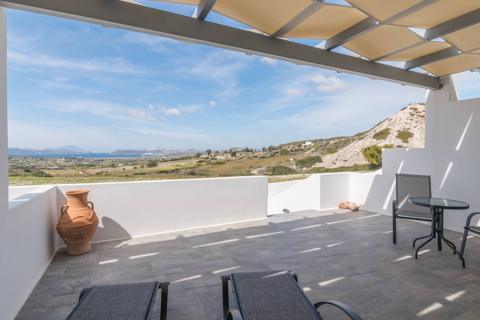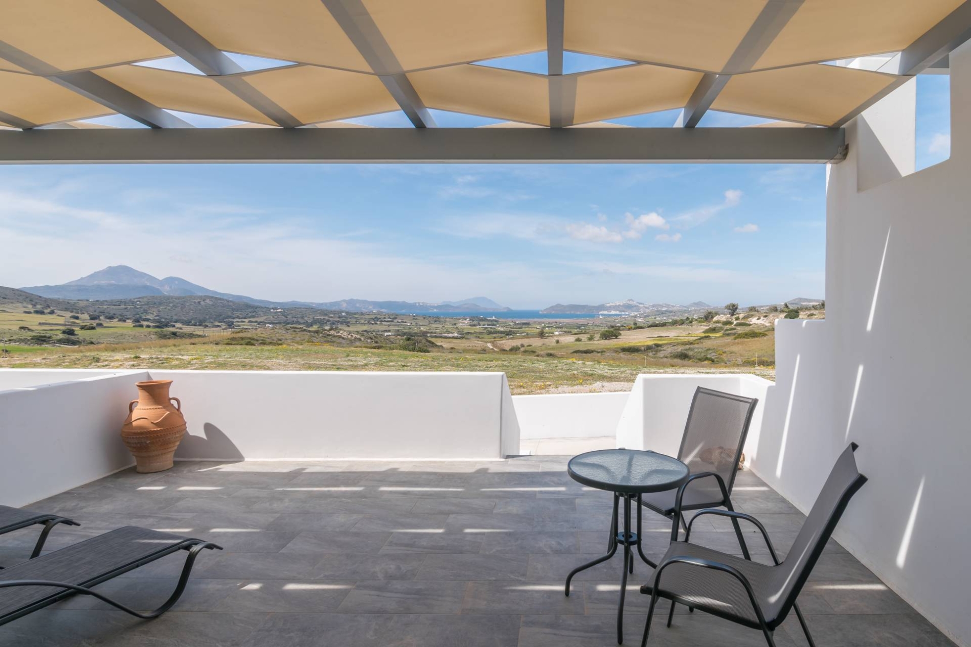 El apartamento de estilo cicládico combina comodidad moderna con encanto tradicional, con un cómodo sofá y un televisor de pantalla grande para entretenerse, y un espacioso baño. Salga a la amplia terraza panorámica, donde encontrará tumbonas y una mesa de comedor, ideales para disfrutar de comidas o relajarse al aire libre.