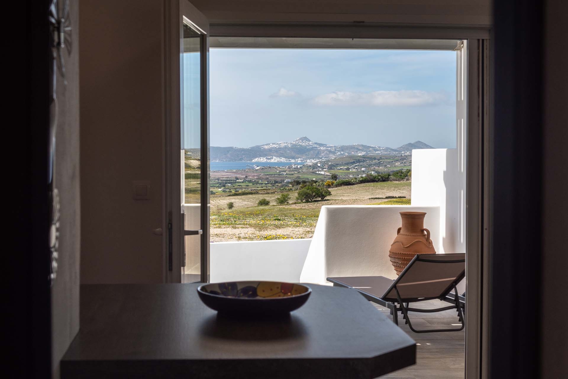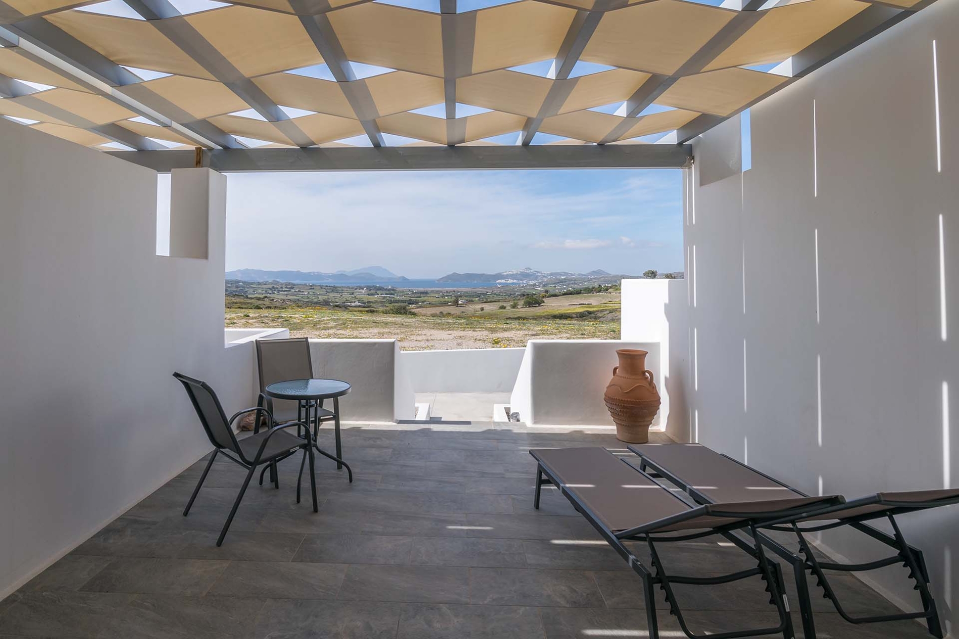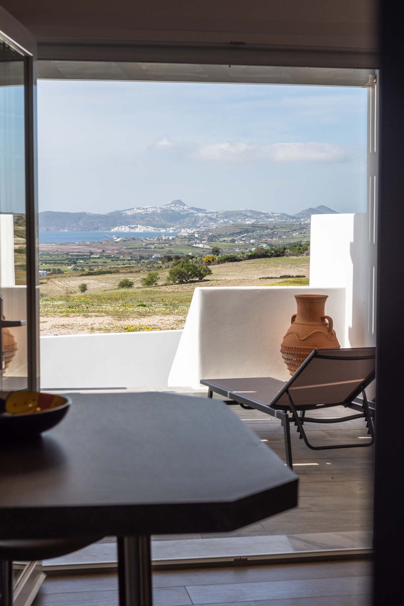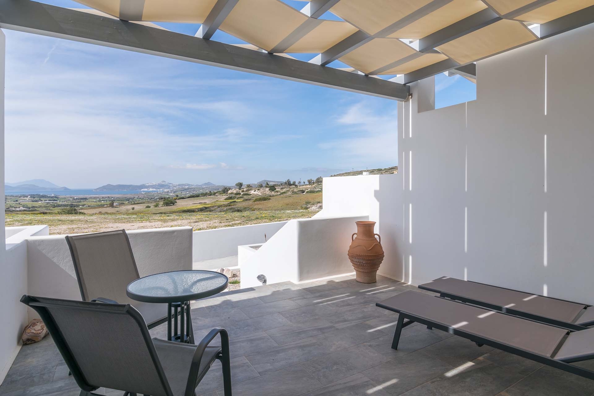 L'appartement de style cycladique allie confort moderne et charme traditionnel. Vous y trouverez un canapé confortable, une télévision grand écran et une salle de bains spacieuse. Accédez à la vaste terrasse panoramique équipée de transats et d'une table à manger, idéale pour prendre vos repas ou vous détendre en plein air.