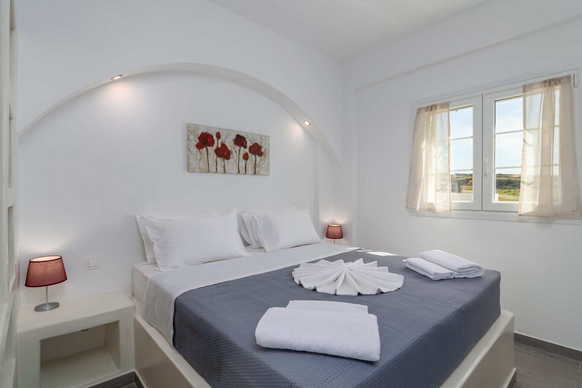 L'appartamento in stile cicladico offre un mix di comfort moderni e fascino tradizionale, con un comodo divano abbinato a una TV a grande schermo per l'intrattenimento e un bagno spazioso. Uscite sull'ampia terrazza panoramica, dove troverete lettini prendisole e un tavolo da pranzo, ideali per gustare i pasti o rilassarvi all'aperto.