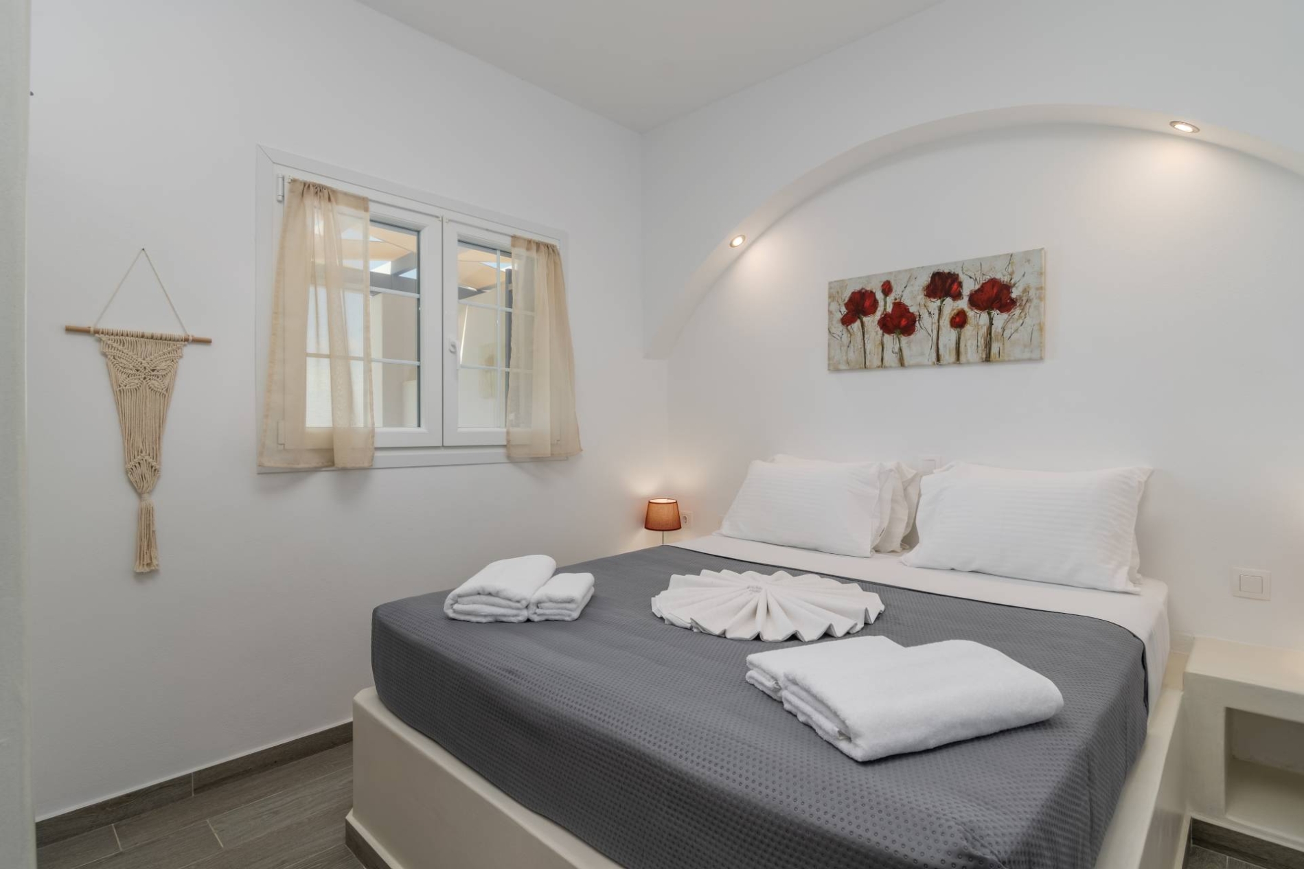 L'appartamento in stile cicladico offre un mix di comfort moderni e fascino tradizionale, con un comodo divano abbinato a una TV a grande schermo per l'intrattenimento e un bagno spazioso. Uscite sull'ampia terrazza panoramica, dove troverete lettini prendisole e un tavolo da pranzo, ideali per gustare i pasti o rilassarsi all'aperto.